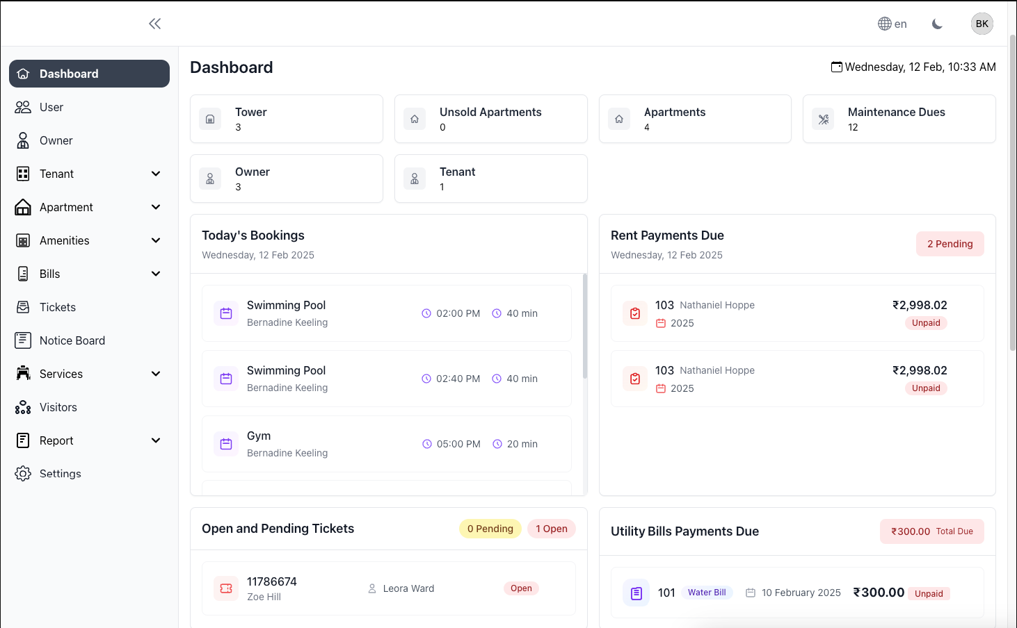 مركز شامل لسجلات الشقق وتفاصيل الملكية ومعلومات السكان. أتمتة تحصيل الإيجارات وإدارة عقود الإيجار والتواصل مع السكان لتجربة سلسة.